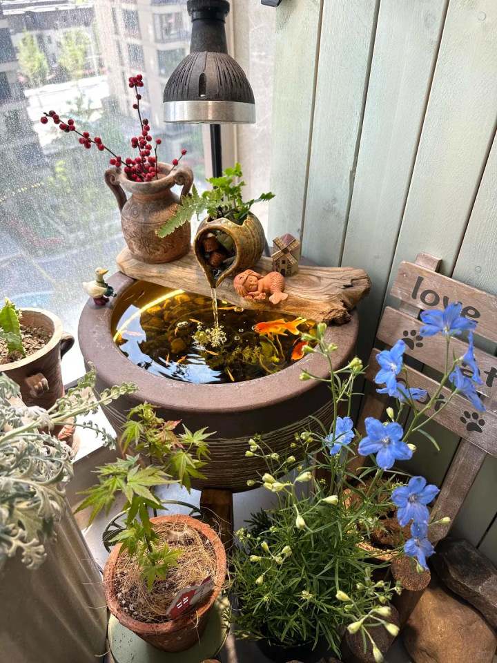 在你的阳台放个陶缸,养两尾小鱼,水从高处滑下来,叮叮咚咚的,像是给整个家按下了静音键。