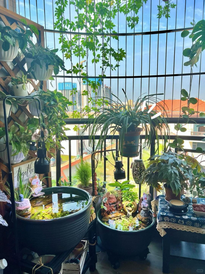 有人担心阳台做水景会不会太潮。其实打理好了,这些问题都不大。常换水,种点铜钱草,水清清的,看着就舒服。